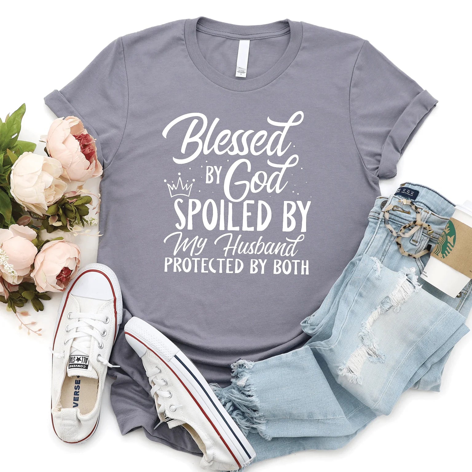 This Blessed by God Spoiled by Husband tee is made with a soft and durable blend of polyester and cotton. Its true-to-size fit won't shrink, ensuring it stays in your wardrobe for years to come. Show your faith in style with this top-quality Christian t-shirt, protected by both God and your husband.